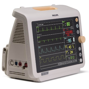 監護儀 飛利浦VM8可監護參數:標準配置參數: 心電(ECG),血壓(NIBP),血氧(SpO2),心率(HR)/脈率(PR),呼吸(Resp),體溫(Temp),有創血壓(IBP)可選配置:微流二氧...